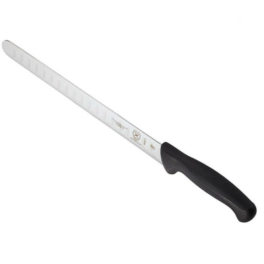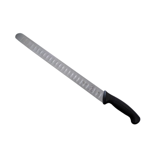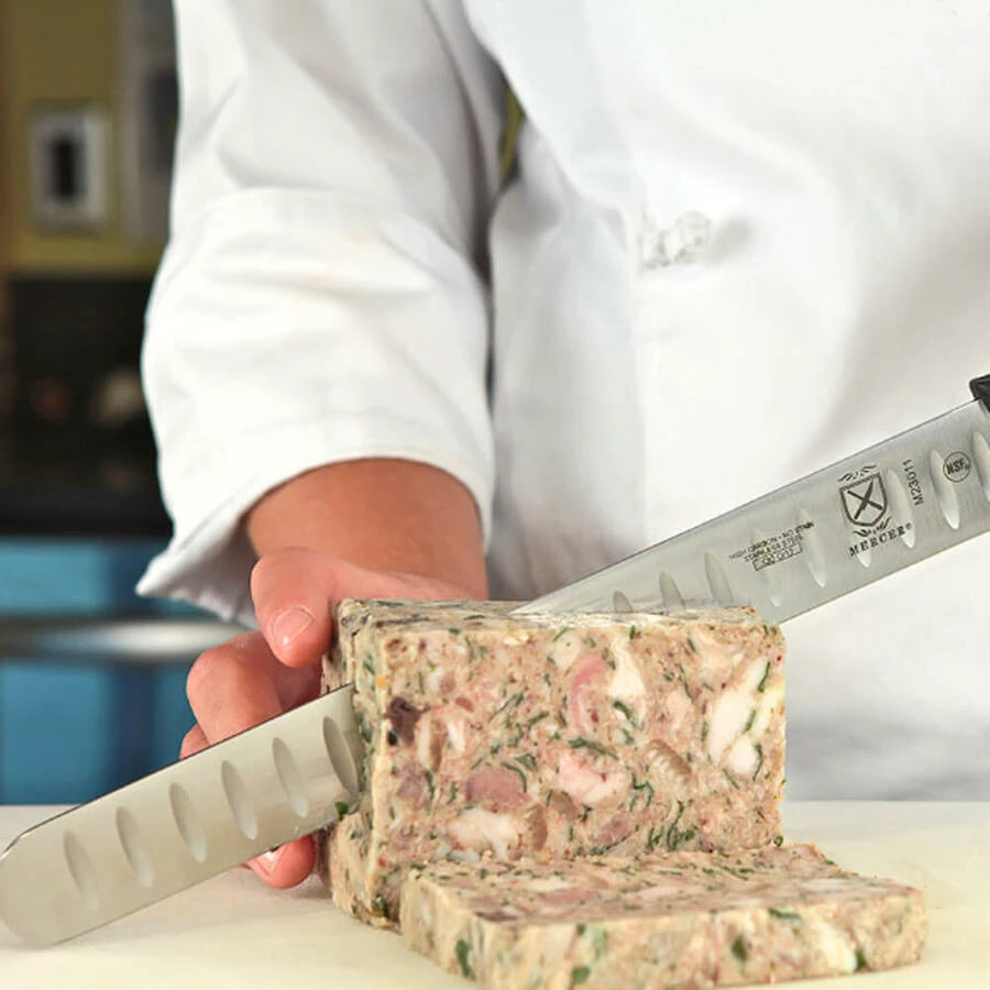 Mercer 14 Inch Brisket Knife with Granton Edge is designed for thinly slicing roast beef, ham or other roasts, Granton (hollow) edge prevents extra thin or soft slices from sticking to the blade.