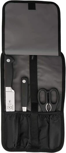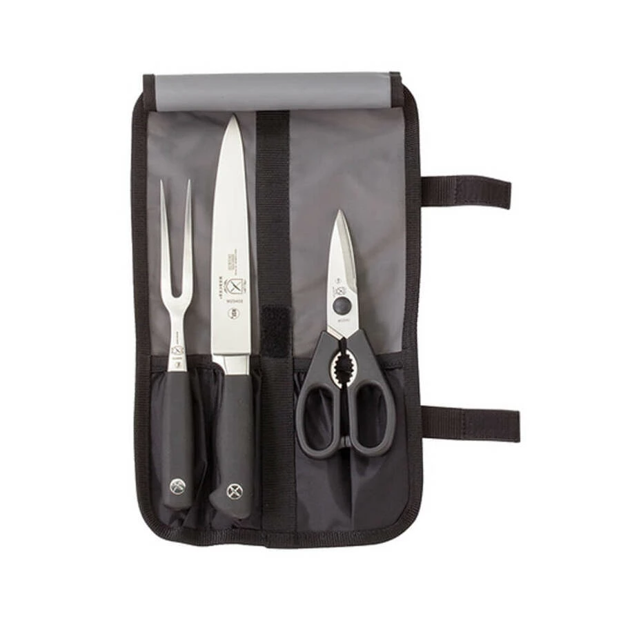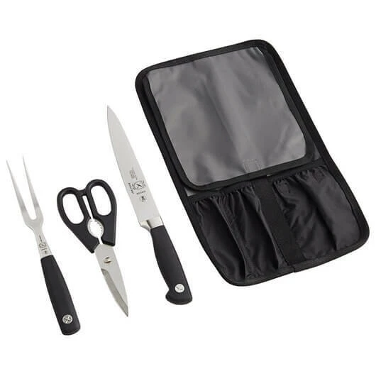 Designed for maximum performance and comfort, this Mercer Culinary|4pc Forged Carving Set provides today’s chefs with a comfortable, efficient and safe means of having their carving knife set with them wherever they go. The ergonomic Santoprene handles are moulded to offer superior comfort and the material used in the handle construction provides a non-slip grip even with wet hands. The high carbon German steel blades are precision-forged for better strength and durability with superior resistance to staining, corrosion and discolouration.Â
