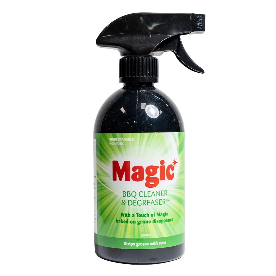 BBQ Magic BBQ Cleaner and Degreaser strips grease, grime, oil and food deposits from your BBQ plates and grills with ease. This non-caustic formula makes BBQ Magic safe to use in and around all food areas and ideal for use on cast iron, stainless steel as well as concrete and outdoor furniture.Â