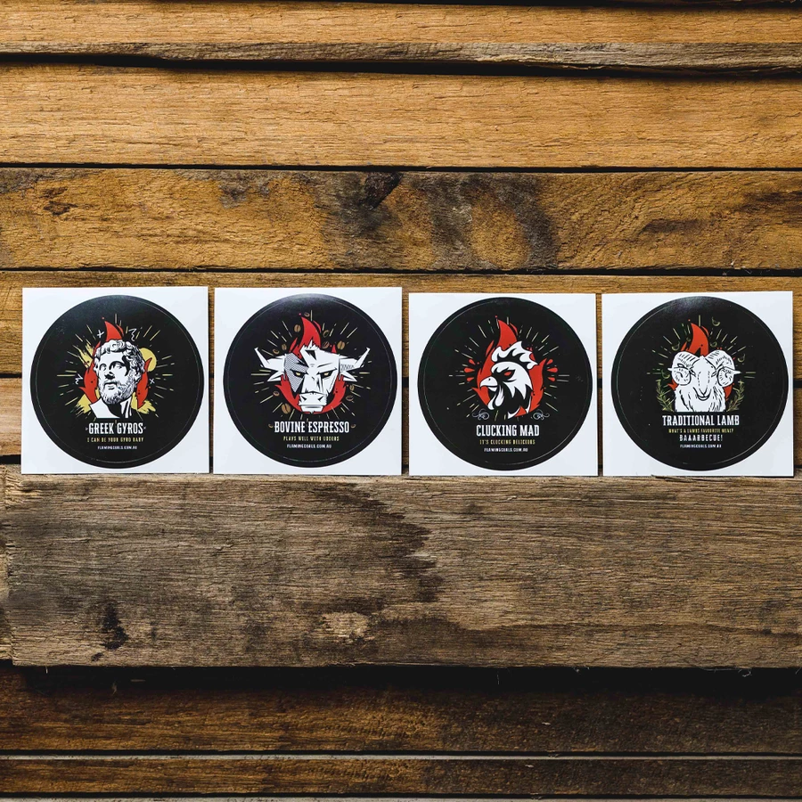 Flaming Coals BBQ Stickers Combo Pack. Introducing the Flaming Coals BBQ Stickers Combo Pack, a must-have for all barbecue enthusiasts! This combo pack includes three sets of BBQ Stickers. It is designed with a range of different designs including BBQ Stickers Rub Brand Characters, Funny BBQ Stickers and BBQ Community Stickers