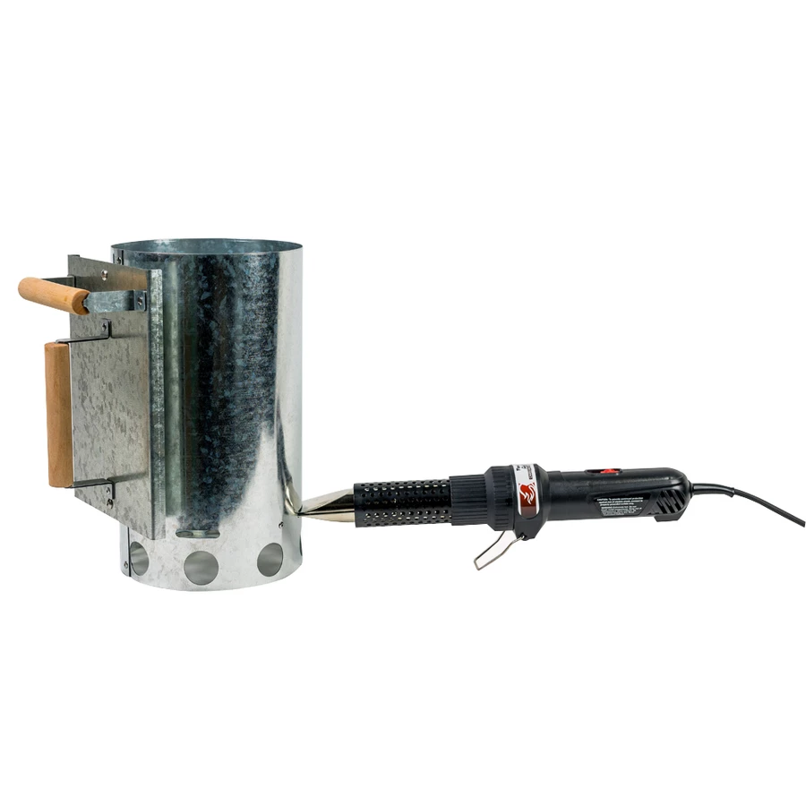 Directions: Point the nozzle directly at the charcoal no further than 3 inches. Flip the switch to “2” to ignite the charcoal. Once the charcoal is lit, flip the switch to “1” to blow hot air onto the surrounding coals. After removing the wand from the charcoal, unplug the charcoal starter wand and place it on its kickstand to cool. Store indoors when not in use.