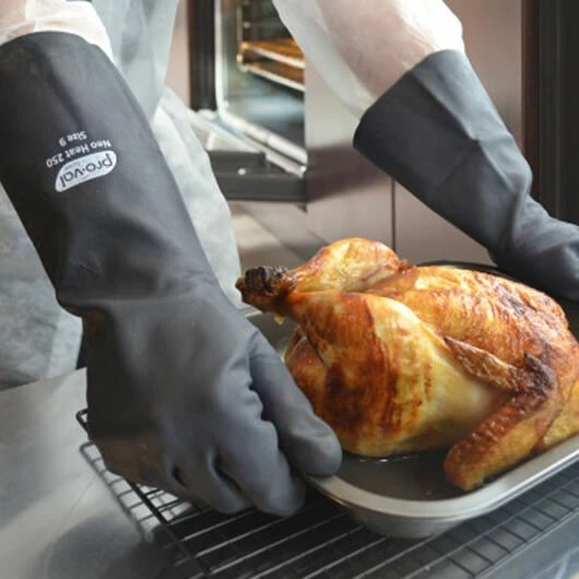 Commercial Grade High Heat Food Handling Gloves -Neo Heat 350 gloves are neoprene gauntlet gloves and are designed to provide contact heat resistance for the hand and forearm up to 350 degrees Celcius. The glove is fully coated with neoprene to create a unique liquid-proof construction and features enhanced flexibility and dexterity, as well as a grip pattern for a secure grip in both wet and dry conditions.