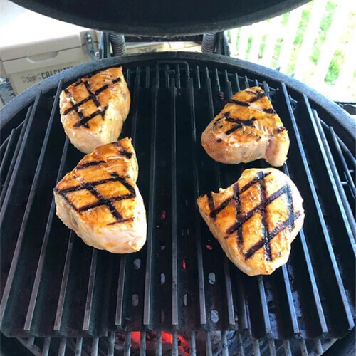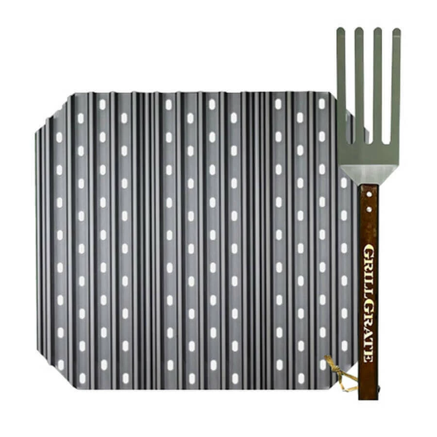 GrillGrates for Kamado | Large Big Green Egg provides protected, high-heat grilling on the Kamado. The bottom plate blocks hot rushing air and flames from charring and drying out food, keeping the juices sizzling with the food instead of feeding the flames. GrillGrates are used on top of the existing grate surface. Every set comes with a GrateTool which is a part fork-a part spatula that fits between the rails to get under your food and lift it without scraping.