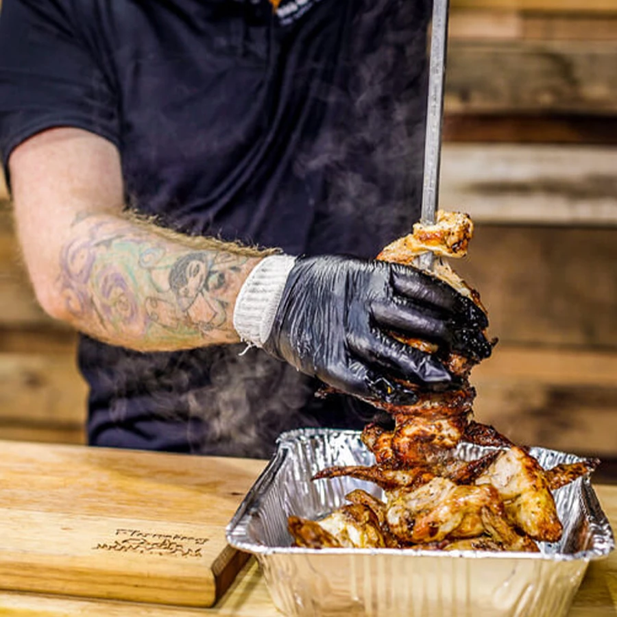 Look the part at your next BBQ and avoid giving your guests a nasty bug using these  Large Black Nitrile Gloves – 100 pack. These gloves don’t show stains from inks, dyes or blood, provide outstanding resistance against many commonly used chemicals and are more resistant to puncturing when you are preparing your cook.