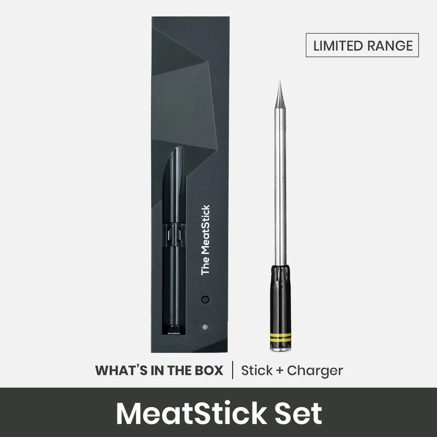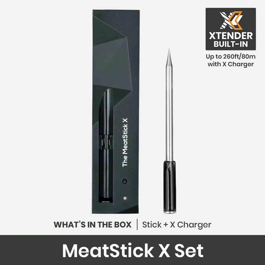 Meatstick X Set 260ft range. The award-winning MeatStick X can withstand the most extreme cooking conditions, with meat temperatures of up to 212°F for up to 24 hours, allowing you to prepare the juiciest, smokiest brisket while keeping an eye on the temperature of your smoker. You can keep an eye on your meat from a distance of up to 260 feet with the X charger.