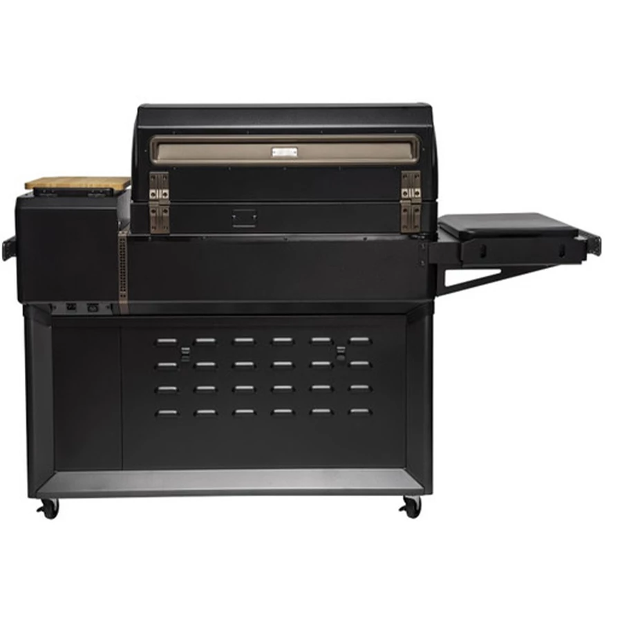 - Includes extra-large powder-coated side shelf for prepping, resting, & more
